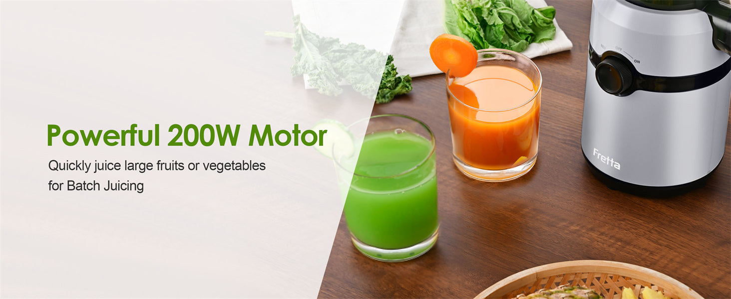 Extracteur de jus à pression à froid Fretta Nifty F5000, machine à jus à mastication lente (goulotte d'alimentation de 4,25 pouces de large, capacité de 1 L, rendement en jus élevé)